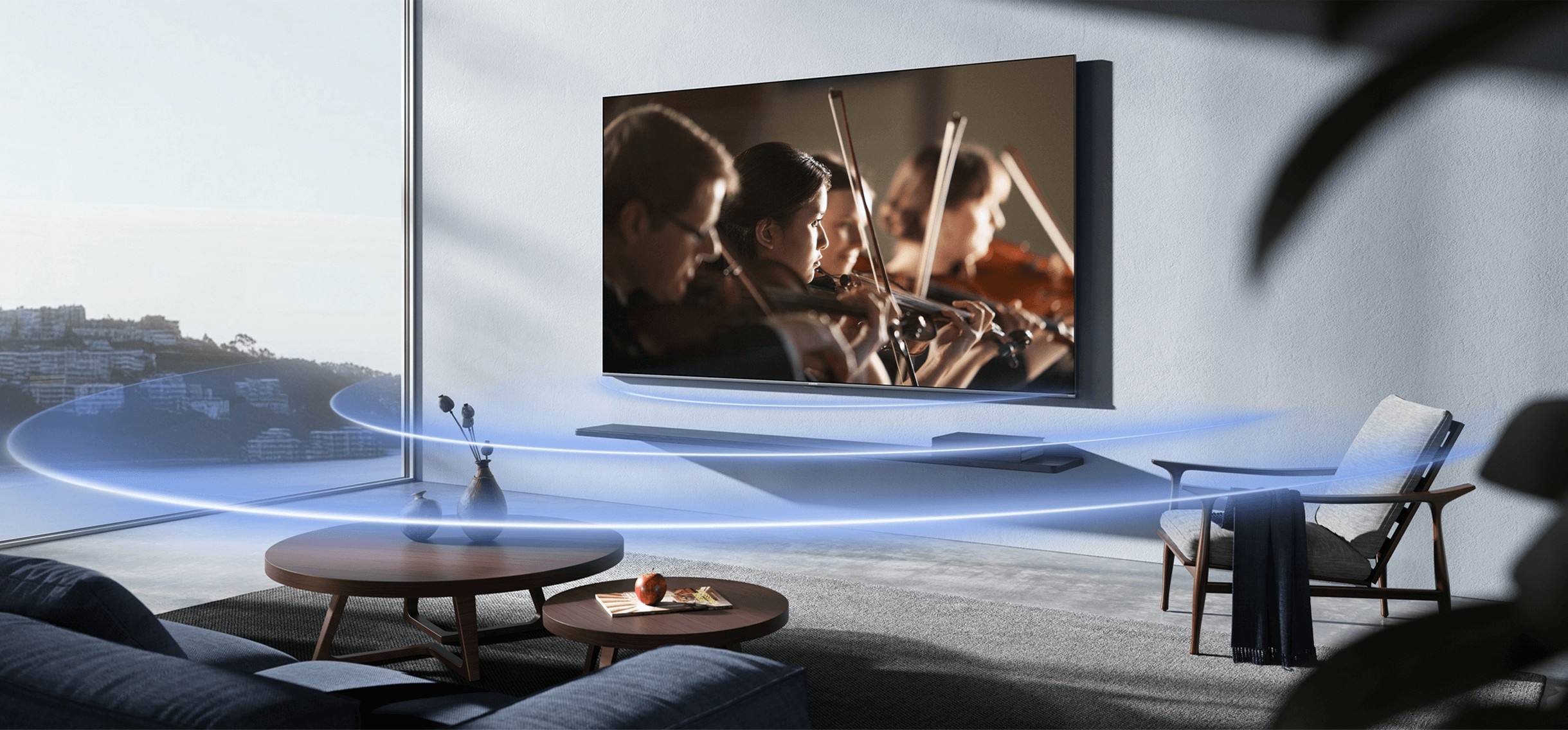 За звук отвечает система мощностью 30 Вт с поддержкой объёмного звучания. Динамики обеспечивают чистое и насыщенное звучание при просмотре фильмов, сериалов и другого контента. Поддерживаются основные аудио- и видеоформаты, включая MPEG, H.264, H.265, FLAC, AAC и DTS. Телевизор также воспроизводит мультимедиафайлы с USB-накопителей.